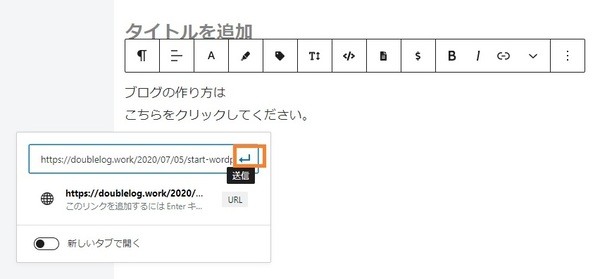 もし、リンク先のページを『新しいタブで開きたい』場合は、URL入力欄下にある『新しいタブで開く』のチェックをオンにしてから同じく送信ボタンをクリックすれば大丈夫です。