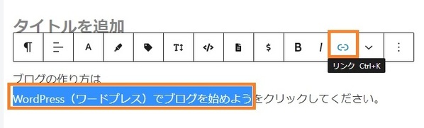 2. WordPressの記事編集画面でリンクを貼りたい文字列を選択し、すぐ上にあるリンクボタンをクリックします。