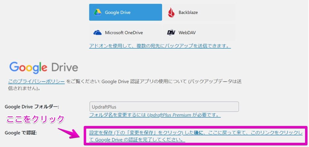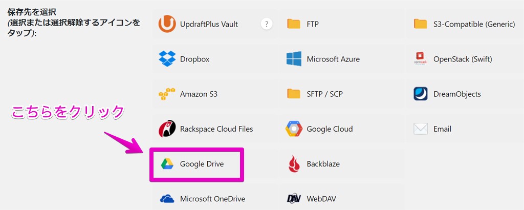 この中から自分にあった保存先を選べばOKですが、今回は『Google Drive』で設定していきます。