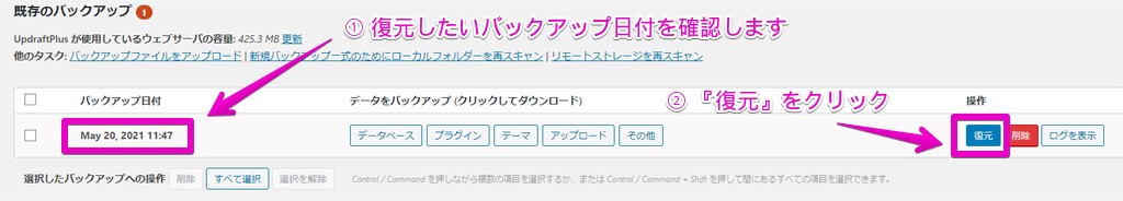 お待たせしました、最後にUpdraftPlusを使ったデータの復元方法について解説していきたいと思います。